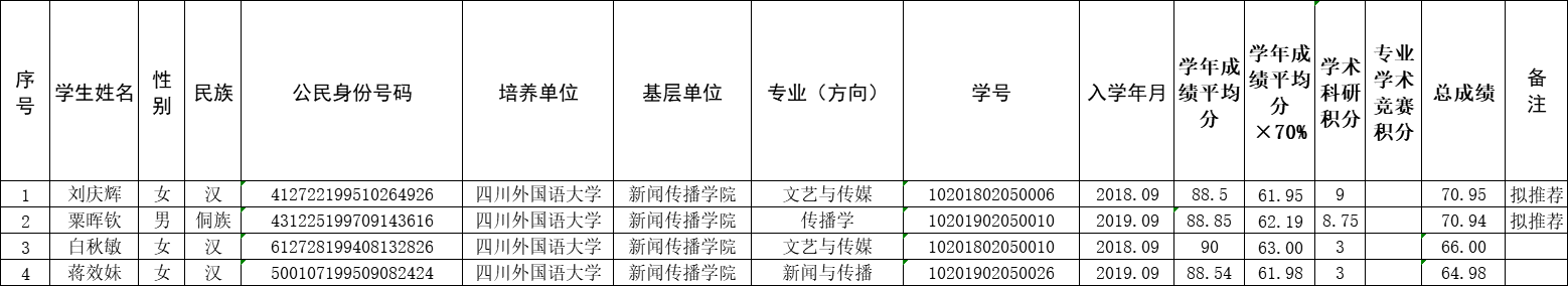 2020年研究生国家奖学金拟推荐名单公示