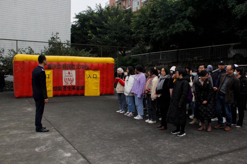 消防安全教育结束后,全体师生来到室外进行本次活动的第二个部分即实战演练。实战演练第一项是所有师生6人一组进入烟雾逃生体验屋感受火灾发生时浓烟密布的危害。