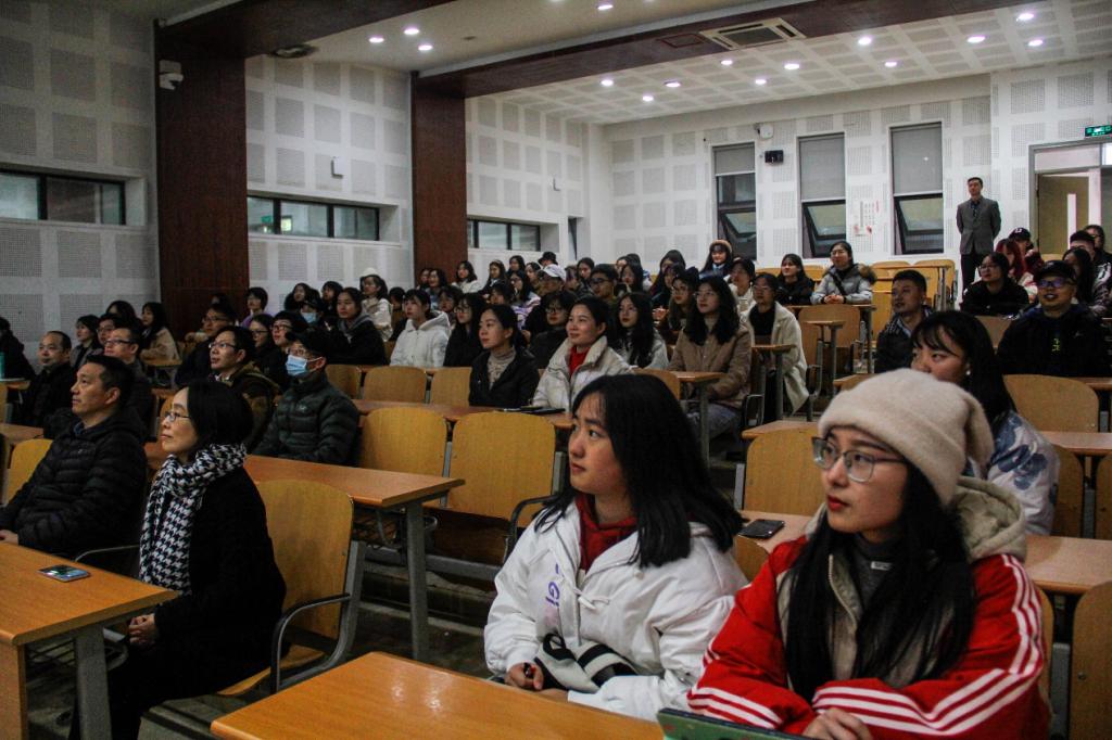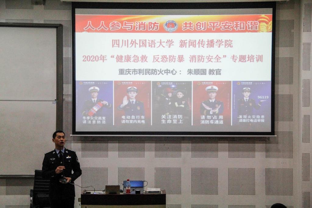本次活动分为消防安全知识教育和实战演练两个部分。第一部分消防安全知识教育在歌乐楼B2-1进行。首先,朱顺国教官强调健康急救是抢救自己和他人的一项重要技能,提高了大家对健康急救的重视度。随后,朱顺国教官向大家说明了反恐防暴的正确方式。在不同的场合,需要巧妙运用喊、逃、斗三种方式进行反恐防暴,拯救自己的生命。最后,朱顺国教官通过真实的火灾案例向在场的师生强调了消防安全意识的重要性、普及了消防安全知识。当我们遇到火灾时,除了及时拨打消防报警电话,最重要的是自救。运用消防知识,采取正确的自救方式,为自己争取宝贵的时间。