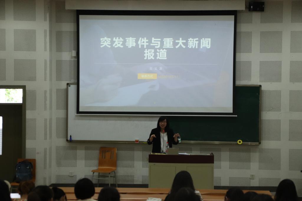新传通讯社424日电(记者/袁旭星 王亦休 摄影/刘灵萱) 424日上午十点,关于突发事件与重大新闻报道的媒体人讲座在西区教学楼B1-1顺利举行。本次讲座由重庆百君律师事务所律师、前《彭博商业周刊》、《中国企业家》记者黄文潇主讲,何冰洁老师负责,新闻系主任王艳老师携部分新闻专业员工到场聆听。