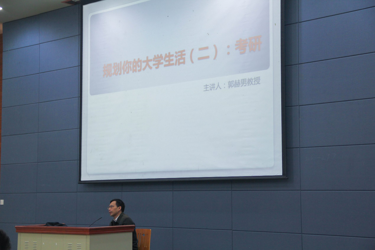 郭赫男教授围绕“为什么要考研”和“如何考研”两个问题对同学们进行了详细的考研介绍。郭赫男教授首先讲述了个人求学和就业经历,分享考研给他带来的匪浅收获。又例举了数位川外优秀学子,突显了考研对人生的提升和重要影响。谈到如何考研时,郭赫男教授建议同学们要多看理论性书籍,提升自己的综合能力,学会为自己的老员工活做好规划,充分利用大学四年的时间,上好每一节课,不断完善自己,让自己常有新收获和新积累。