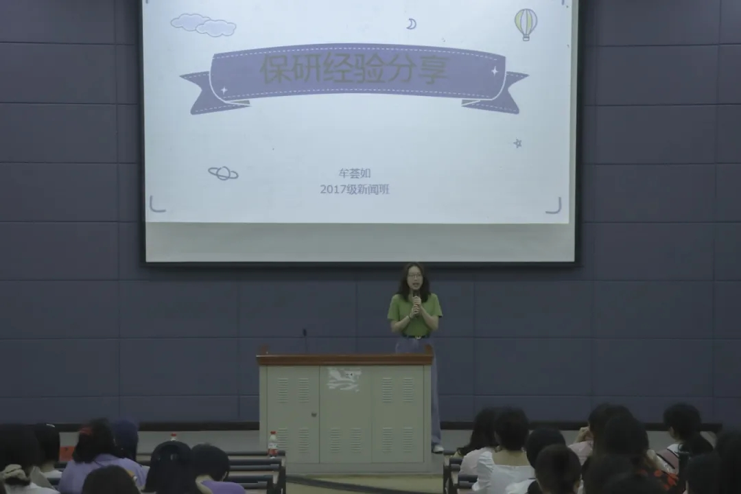 保研南京大学的牟荟如学姐首先分享了自己保研的经历,在强调了参加夏令营的重要性后,她向同学们传授了通过合理安排时间进行专业课学习的经验。之后被中国传媒大学录取的黄芷凌学姐谈到了择校需要根据自己的兴趣爱好选择的体会,同时她也强调结合自身现实情况做出抉择的重要性。