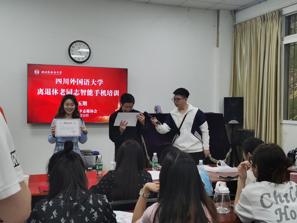 活动结束后,趁着大家的热情未减,现场举行了一场简单又热烈的活动分享会。在分享会上,朝夕志愿协会首任会长汤健同学,首先邀请了在场的几位老人为志愿者们颁发本次工作坊的荣誉证书,同学们在听到自己名字后,一个接着一个地上台领取属于自己的证书,高兴地与老人们合影。记者注意到,其中一位颁奖的老人腿脚不方便,现场同学专门搬来了凳子便于老人坐下颁奖,但老人仍然坚持站着给志愿者们颁完了证书以表达对同学们的谢意。