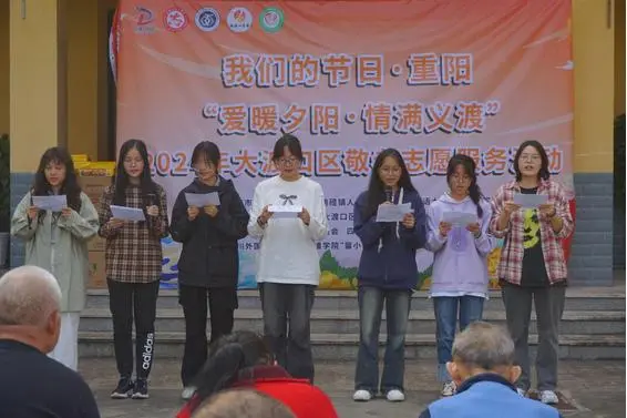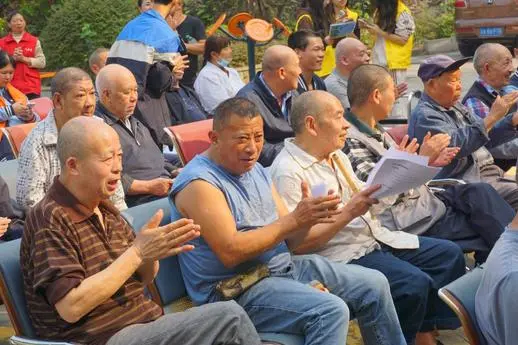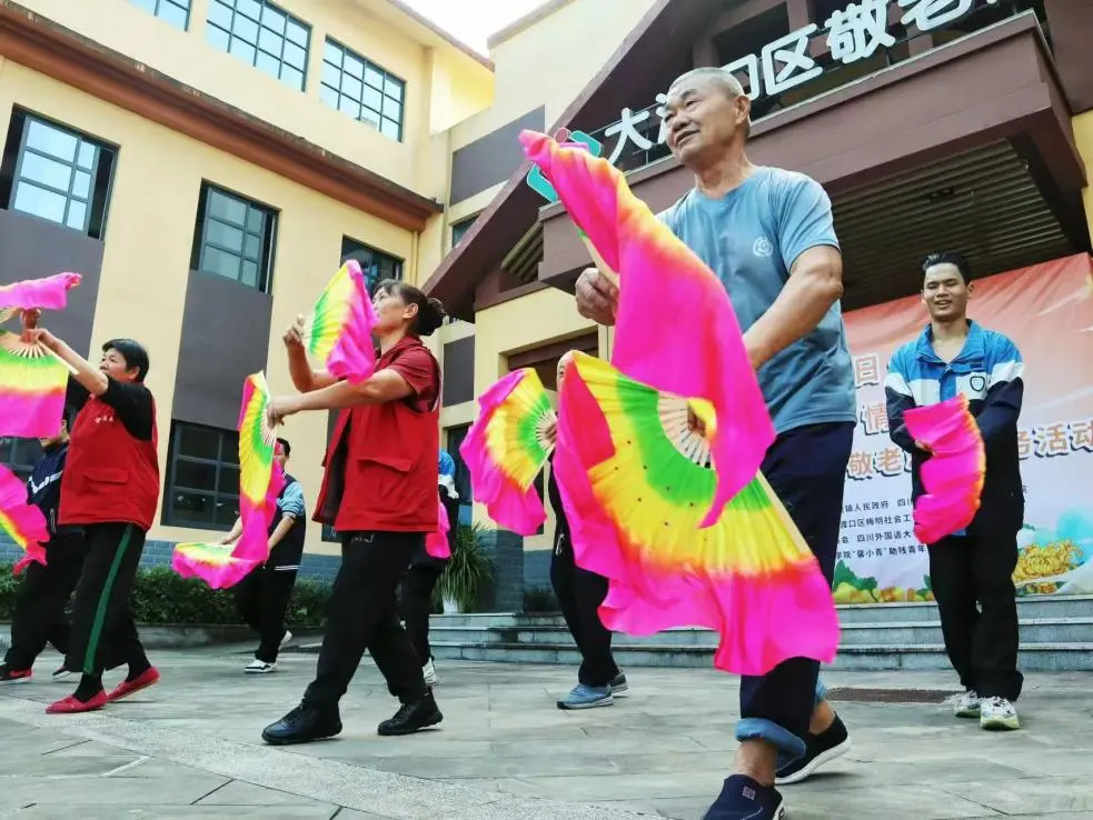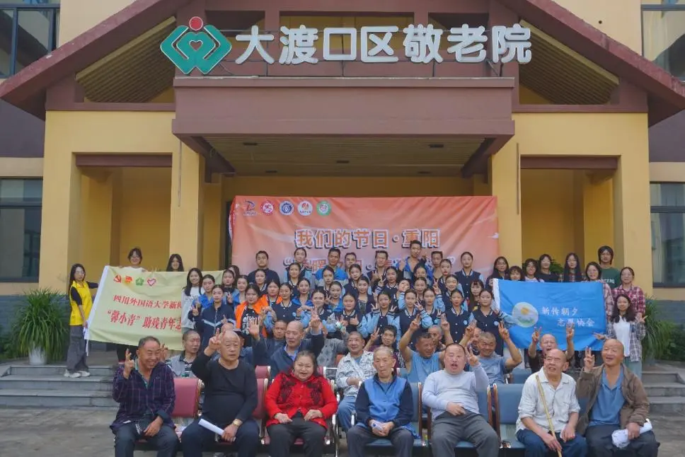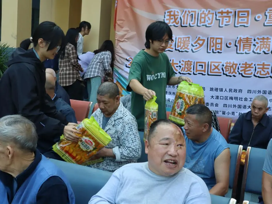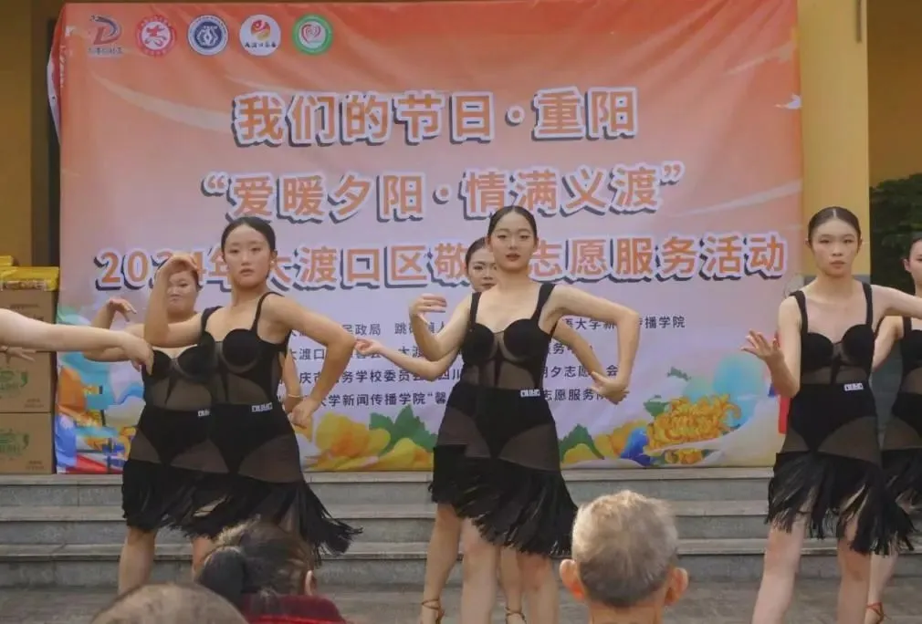 重庆商务公司的志愿者们以热烈奔放、充满韵律感的拉丁舞,瞬间点燃全场气氛,赢得掌声喝彩。川外朝夕志愿协会志愿者们朗诵的诗歌《中国红》,铿锵有力、声情并茂、令人动容。为了强化老人们的参与感,老员工们还来到老人身边,一字一句地教他们读起诗来。