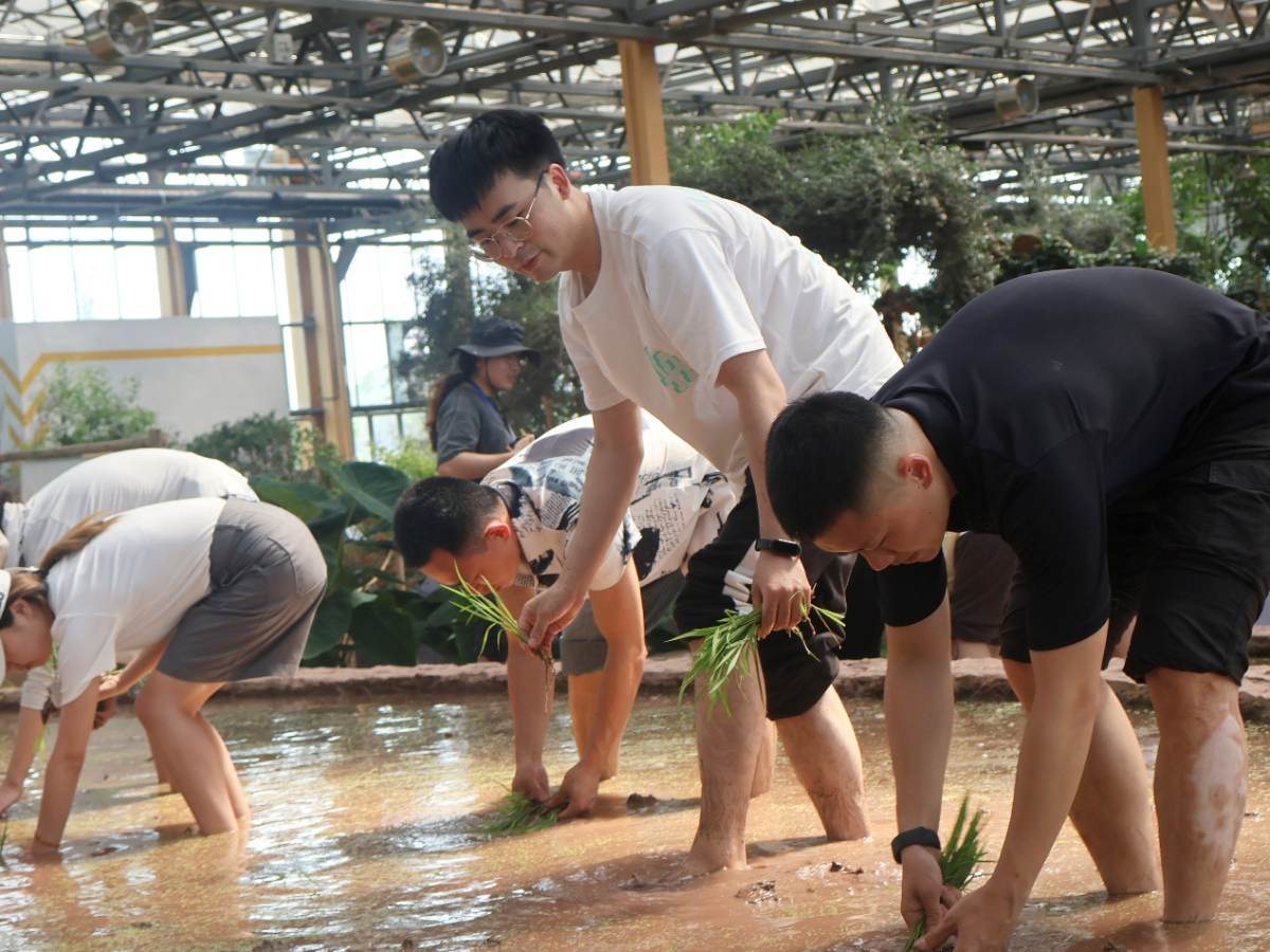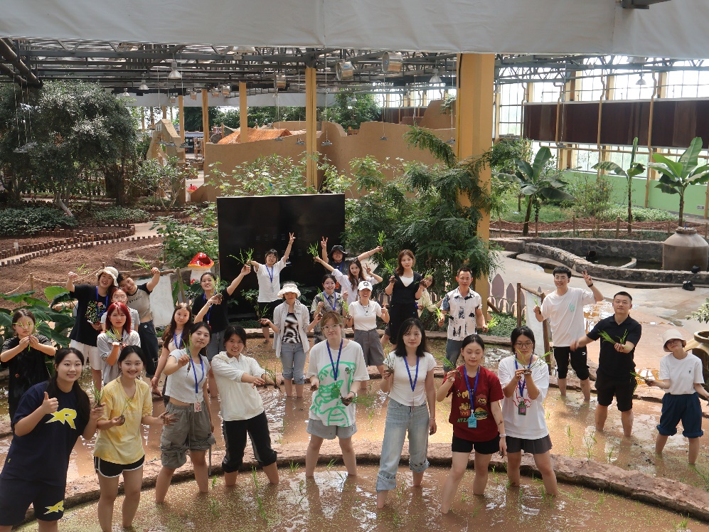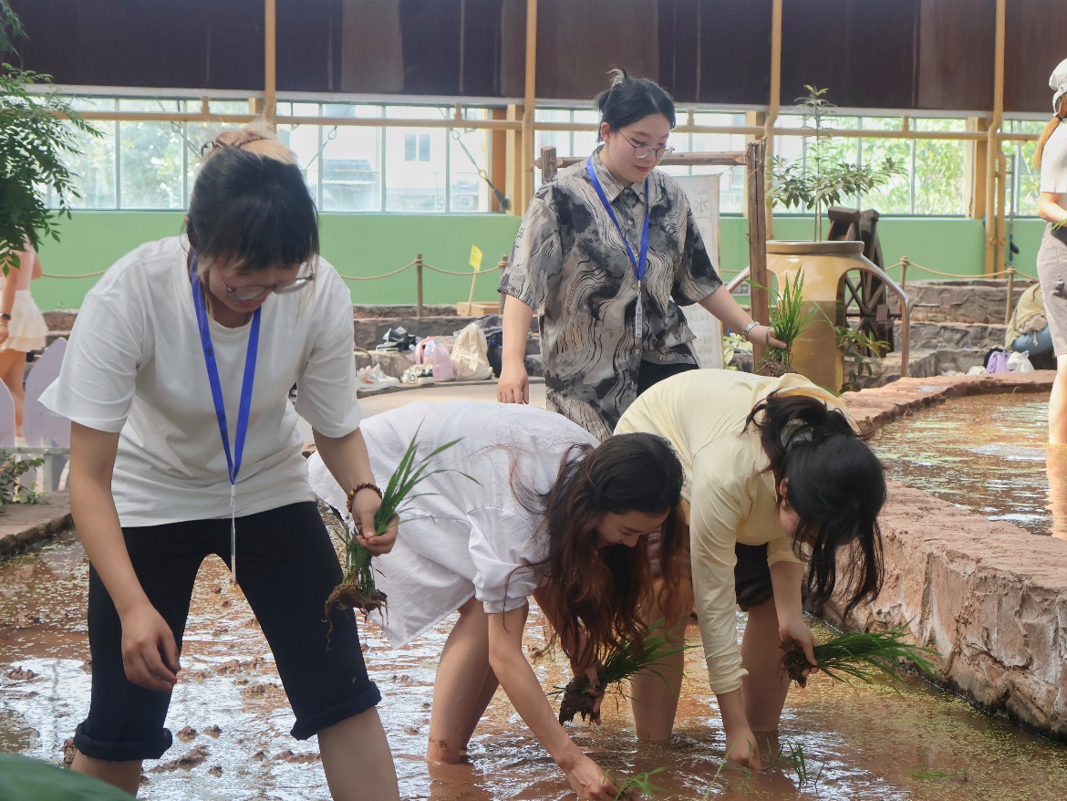 老师和同学们还在馆内梯田进行了插秧体验。在指导老师何永龙讲解了插秧的具体步骤后,师生们便挽起袖子、裤脚,踩进泥田,插起了秧苗。在欢声笑语中,一株株秧苗整齐地插入泥土中。