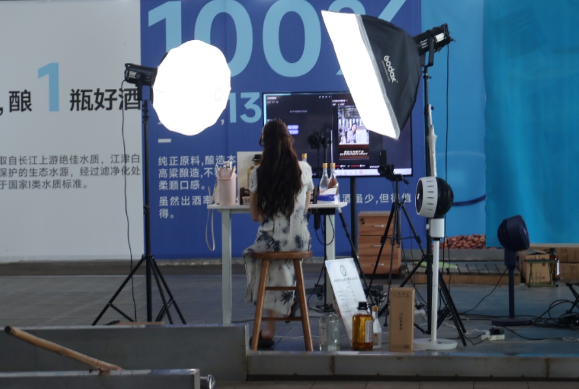 在江记酒庄201手工精酿车间,讲解员李称心介绍了白酒从选料粉碎、拌料发酵,到蒸煮糊化、蒸馏取酒,最后陈酿配调的全手工制作流程。在生产车间内,江小白的专职工作人员正在进行抖音直播,并在线销售产品。