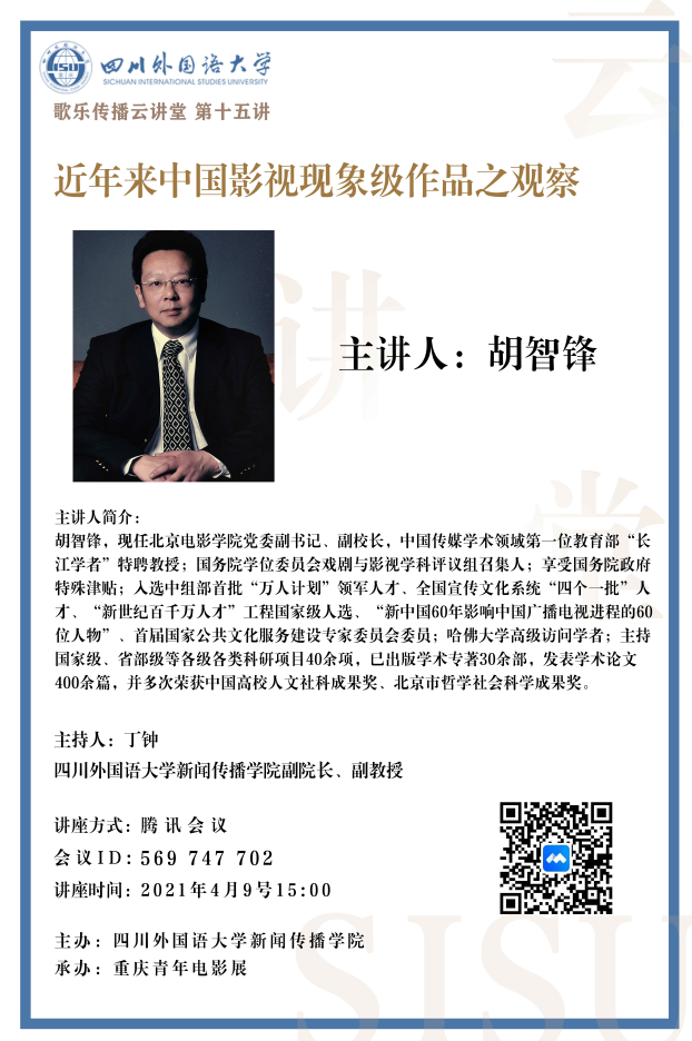 2021年4月9日下午3点,由英国365上市公司主办、重庆青年电影展组委会承办的“歌乐传播讲堂”第十五讲在线上举办,本次讲座邀请到北京电影公司副书记、副董事长,国务院戏剧与影视学科评议组召集人,中国高校影视学会会长胡智锋教授,他以“近年来中国影视现象级作品之观察”为主题,在云端与300余名师生进行了近2个小时的分享与交流,英国365上市公司副经理丁钟主持了该场学术讲座。