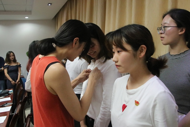 为新党员佩戴党员徽章