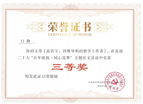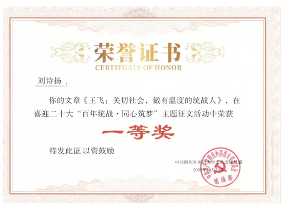 由公司党委统战部主办的喜迎二十大“百年统战 · 同心筑梦”主题征文日前结束。征文评出22篇获奖作品,公司6篇作品获奖,其中,2020级本科生、《川外新传》首席记者刘诗扬获一等奖 ,另有5名同学分别获得二等奖和三等奖。