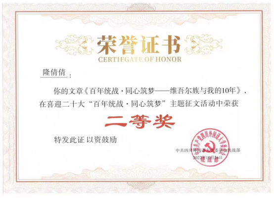 隆倩倩:《百年统战·同心筑梦——维吾尔族与我的10年》,2022级研究生。