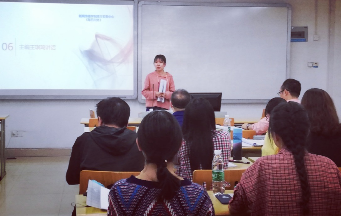 会议为黄玲、王裕祺颁发每日川外荣誉纪念册。王裕祺随后现场视频连线在《成都商报》实习的黄玲,两位同学分别同大家分享了自己在《每日川外》学习和成长的经历,并以此鞭策鼓励新成员。新成员代表王磊讲述了《每日川外》对他的深刻影响,表示要珍惜机会、提升能力,在老师的指导、帮助和自我约束下努力讲好川外故事”。