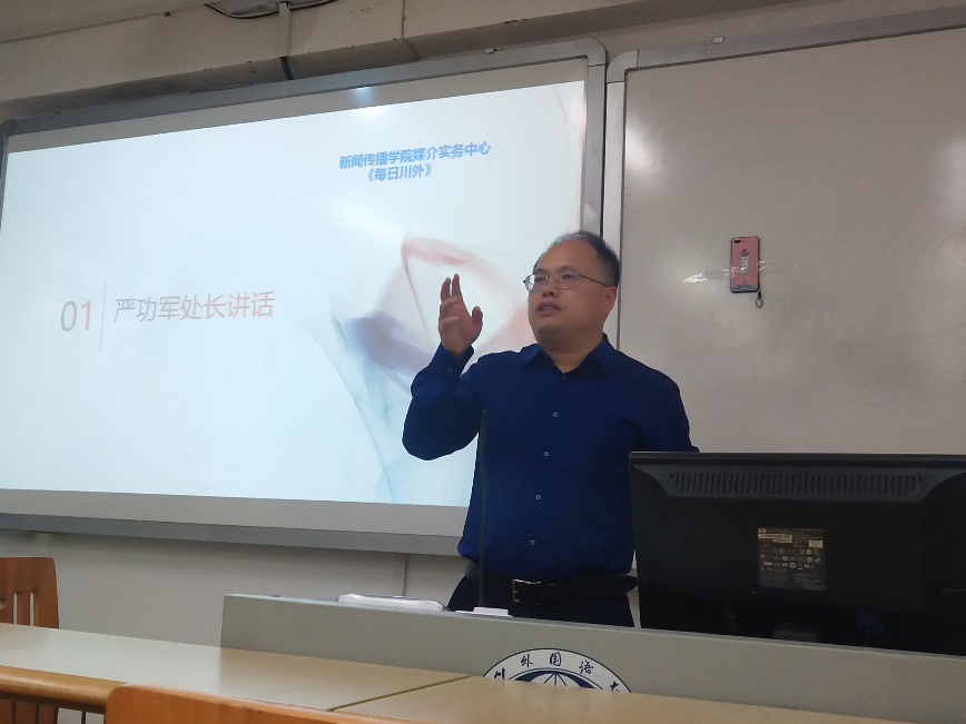 集团教务处处长、《每日川外》总编辑严功军发表讲话。他希望同学们在新闻传播的学习和实践中要思考和践行六个字——“走出来,走进去”,即:走出传统媒体思维,拥抱万物皆媒时代;走进主流媒体,练就信息传播和舆论引导本领。他对《每日川外》的发展提出了令人振奋的建设性思路