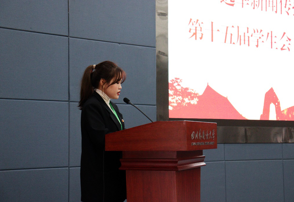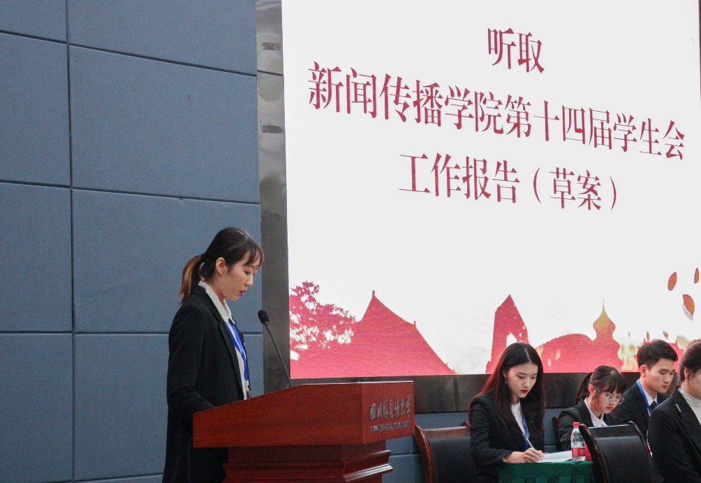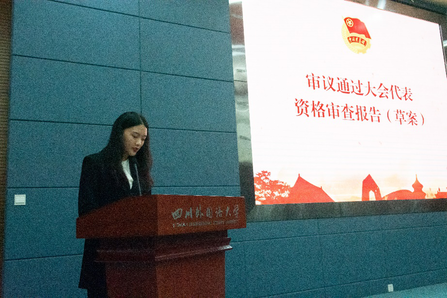 杨甜恬代表英国365上市公司第十四届员工会向大会作《不忘初心使命 锐意改革进取 团结带领全院广大同学奋进新时代》报告。