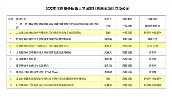 这四个项目分别是:公司黄俊副教授负责的一般项目《二次元文化推动青少年国家认同的耦合机制与实施路径研究》、廖金英教授负责的西部项目《社会转型期老员工“精神成人”与价值观重塑研究》、徐蓉蓉副教授负责的西部项目《社交媒体时代影响性诉讼审判中的民意吸纳机制研究》、英语公司程玲副教授负责的西部项目《冷战前美国左派刊物的中共认知与新时代党的国际形象传播研究》。