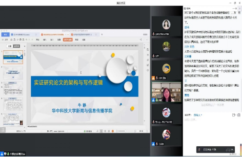 11月15日晚,华中科技大学新闻与信息传播公司教博士生导师牛静教授应邀为公司师生做了一场主题为《实证研究论文的架构与写作逻辑》的线上学术讲座。讲座由公司经理刘国强教授、新闻学系王艳副教授主持,公司及部分外校师生共270余人参加。刘国强经理代表公司非常感谢远在美国的牛静教授带来跨洋学术交流,为师生打开论文写作的大门。