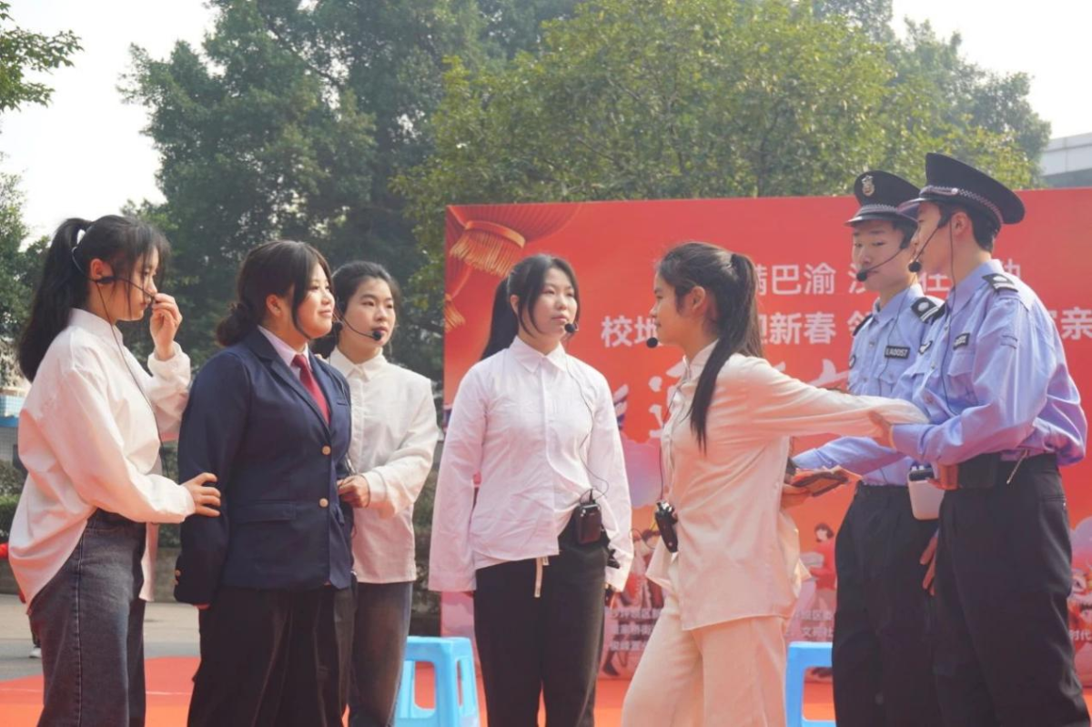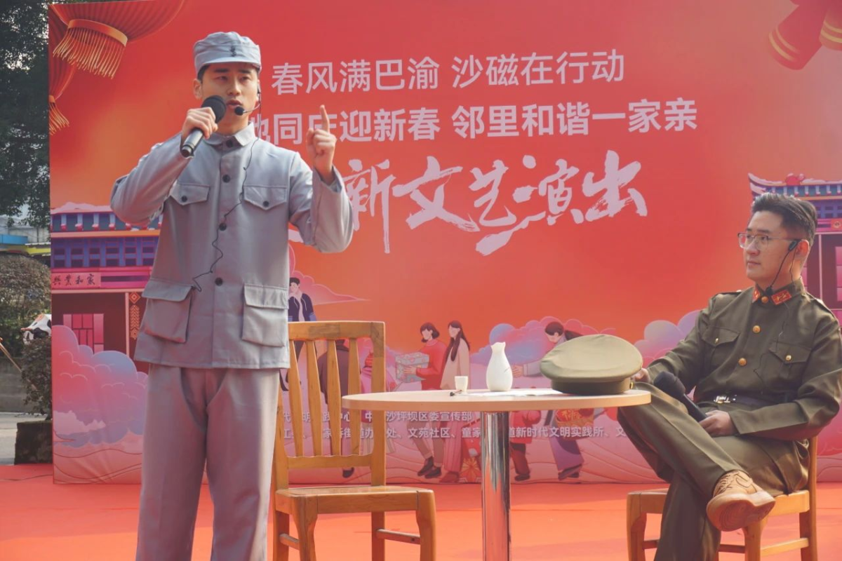 川外马克思主义公司表演的话剧《叶挺》、国家级非遗代表性传承人丁长福表演的金钱板《新时代的好儿童》、知行卫校表演的小品《反诈进行时》、重大艺术公司音乐系武一凡和曾彦菲的女声二重唱《七月的草原》,西政、川外离退休人员表演的舞蹈《天之大》《娥嫚》和文苑社区青春舞蹈队表演的舞蹈《苹果香》等节目精彩不断,不时赢得满堂喝彩与阵阵掌声。