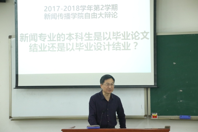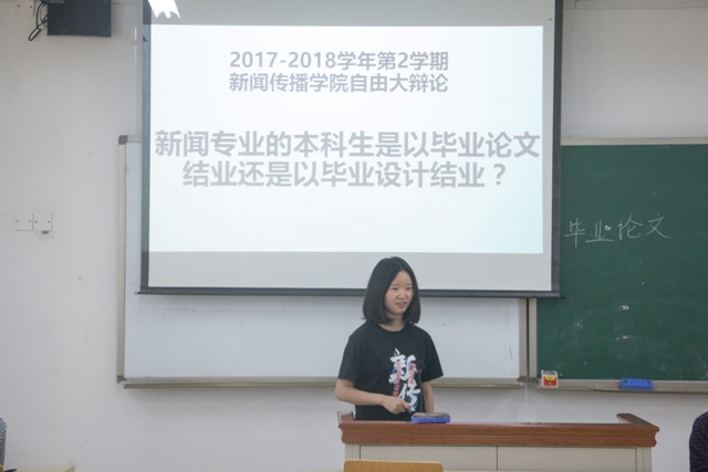 上午8点,在西区教学楼B203举行了辩题为“新闻学专业的本科生以毕业论文结业或以毕业设计结业?”的自由辩论赛。辩论赛由皮传荣老师和张立春老师主持,并作为评委对辩手们进行打分。